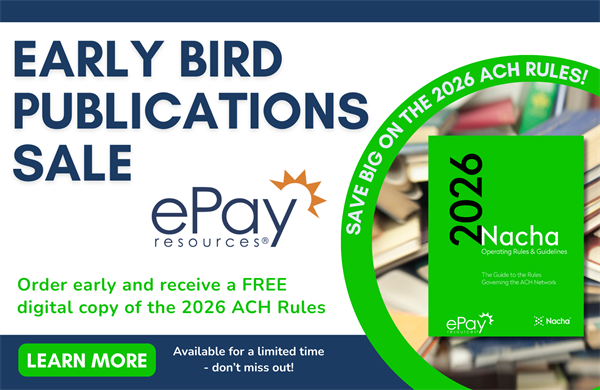 As a member of ePayResources, your organization receives a complimentary copy of the Nacha Operating Rules and Guidelines, shipped by late January each year. Our Early Bird Sale, starting October 1, gives you the opportunity to purchase additional copies and/or the ACH Rules Online at a special Early Bird discounted rate. This is the deepest discount we’ll offer on the 2026 ACH Rules and if you order by November 19, each copy will include complete access to the ACH Rules Online, a searchable and printable companion to the printed book.