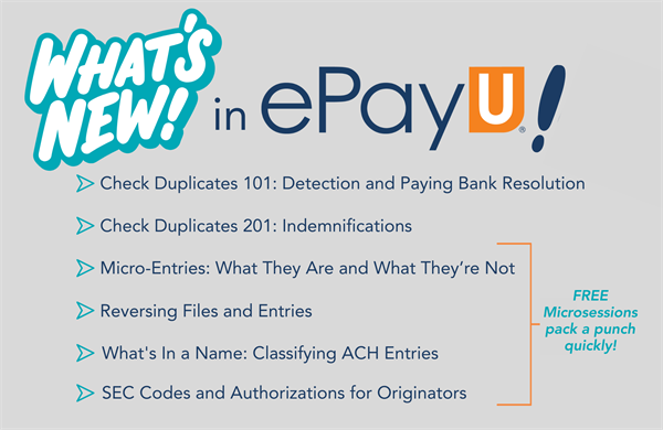 ePayResources' financial institution members have access to over 90 FREE payments courses in ePayU, our online learning platform. An additional 30+ courses of Premium Content are also available for a nominal charge. This benefit is available to any employee of your institution!