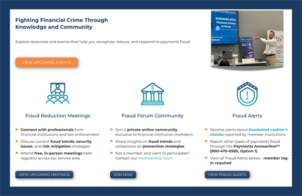 We've recently refreshed our website, including the addition of a new Fraud landing page to act as a one-stop-shop for our members to quickly find what they need from our range of fraud-fighting resources, opportunities, and tools, including: