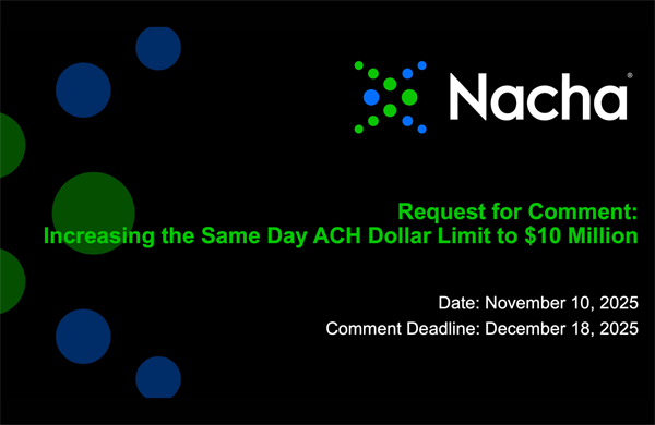 Nacha seeks comments by Thursday, December 18, 2025 on a proposal to continue to expand the capabilities of Same Day ACH by increasing the per-transaction dollar limit for Same Day ACH entries from $1 million to $10 million. Increasing the Same Day ACH dollar limit is expected to improve Same Day ACH use cases and contribute to additional adoption.